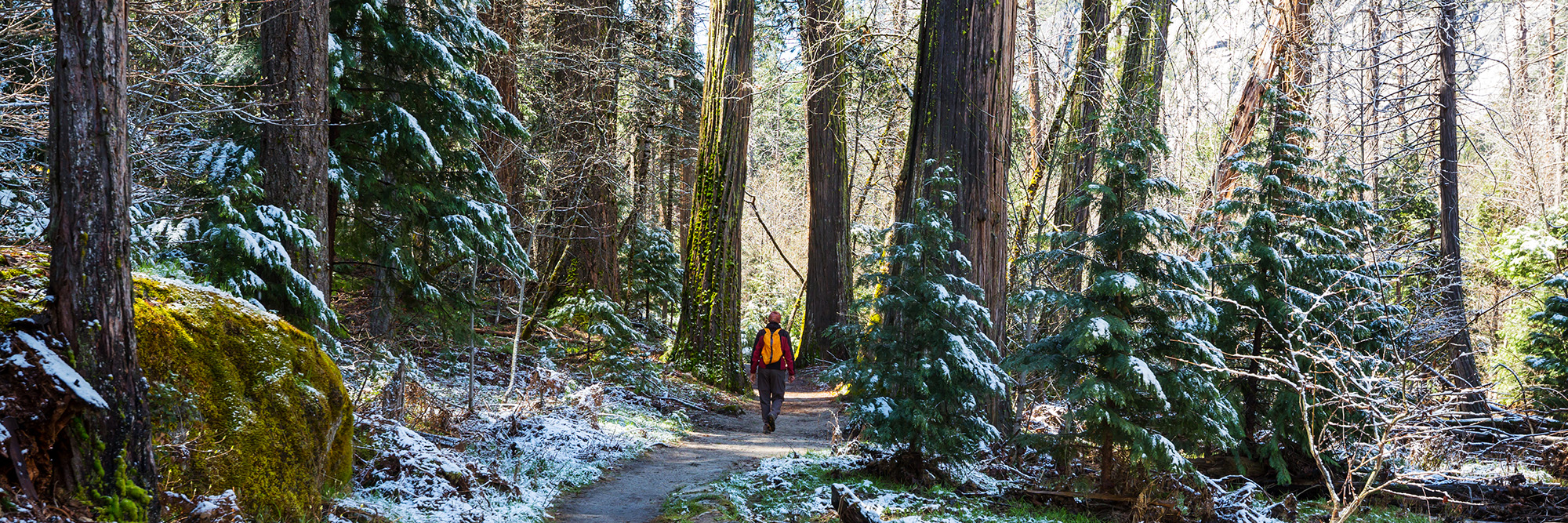 The trail follows many of the Valley's first east-west trails and wagon roads. It offers a nice opportunity in Yosemite Valley to hike on a fairly level trail with solitude. While some of the trail passes near roads, most of the trail takes you through meadows, talus slopes at the base of the granite cliffs, and near the Merced River. You can access the trail from many places throughout the Valley; however, the mileage and description used here starts at the Lower Yosemite Fall area (follow signs for Valley Loop Trail). Route-finding can be difficult in places, so it is best to bring a map with you as it will orient you with the various landforms in the Valley, which are often listed on the trail/directional signs. During winter season, the trail is often snowy and icy in places, particularly along the south side of Yosemite Valley. In these areas, use extreme caution as it may be hard to get traction on ice and route-finding may be difficult in snowy areas.
