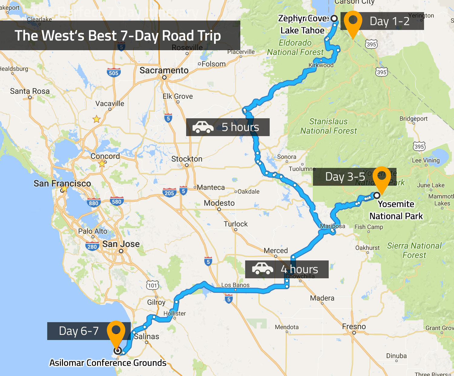 - Yosemite (Days 3-5): Incomparable vistas and legendary American icons. Spend 3 days exploring the natural wonder of Yosemite National Park.