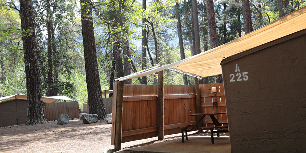 Overlooking Yosemite Falls and Half Dome, Housekeeping Camp features three-sided concrete structures with a canvas roofs and privacy curtains.